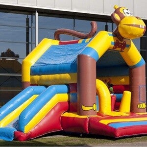 Springkasteel met aan de ingang een grote apenkop. Als de kinderen naar binnen springen kunnen ze zich uitleven als een echte aap, dit mede door de apige obstakels. Door de glijbaan wordt dit springkasteel nog apig plezant.